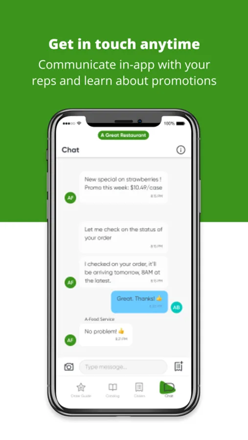 - Get in touch anytime: communicate directly with your A-Food Service rep in the app