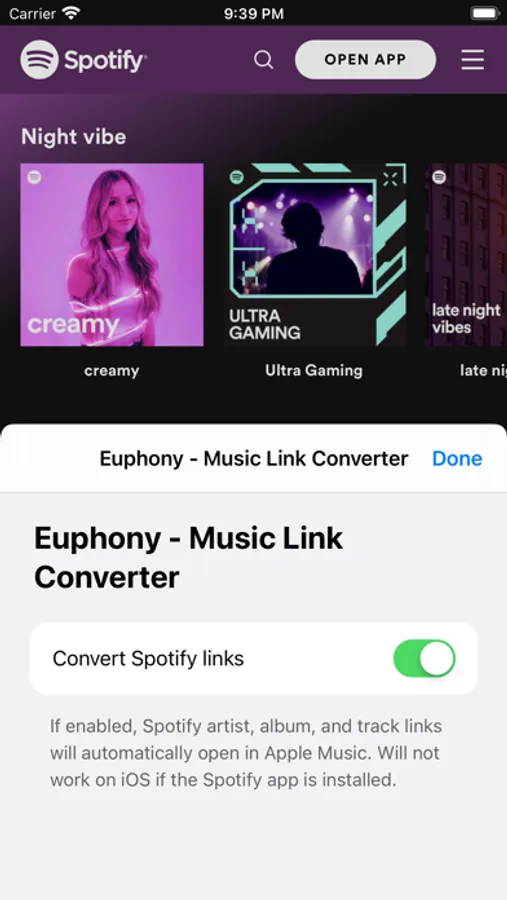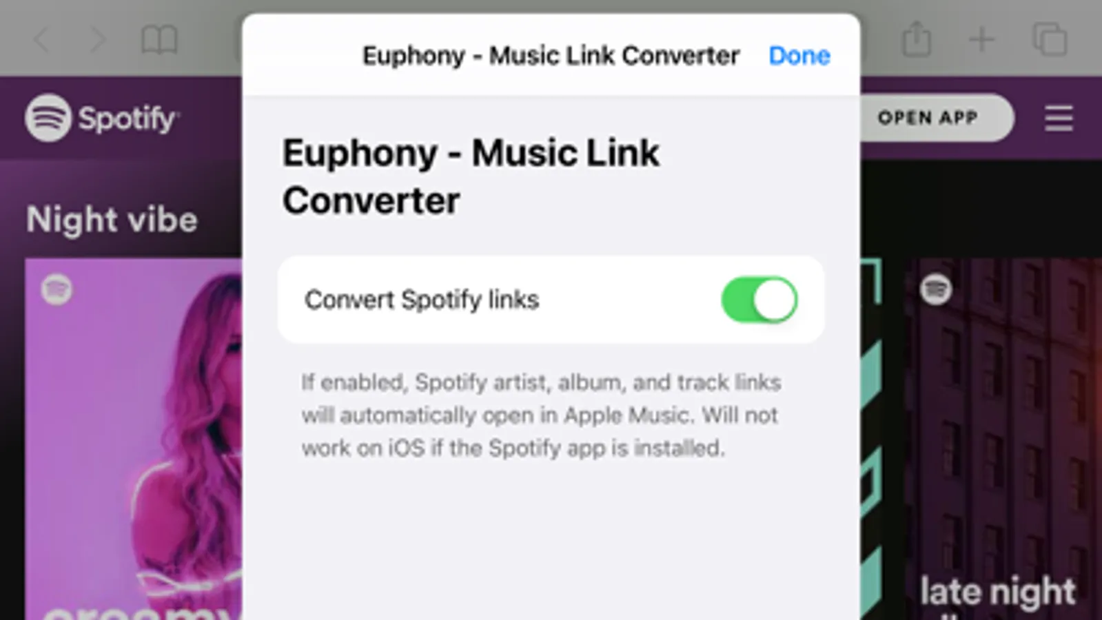 Euphony is a Safari extension that converts artist, album, and song links between Spotify and Apple Music. Once enabled, it will automatically open Spotify links in Apple Music.