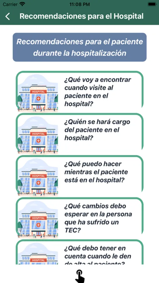 CuidaTEC es una aplicación móvil que contiene estrategias educativas y recomendaciones acerca del cuidado de las complicaciones, el funcionamiento y la calidad de vida de los pacientes con historia de TEC moderado o grave. Contiene videos, dibujos, material interactivo y encuestas con las principales recomendaciones a tener en cuenta desde la fase hospitalaria, hasta los cuidados a largo plazo.