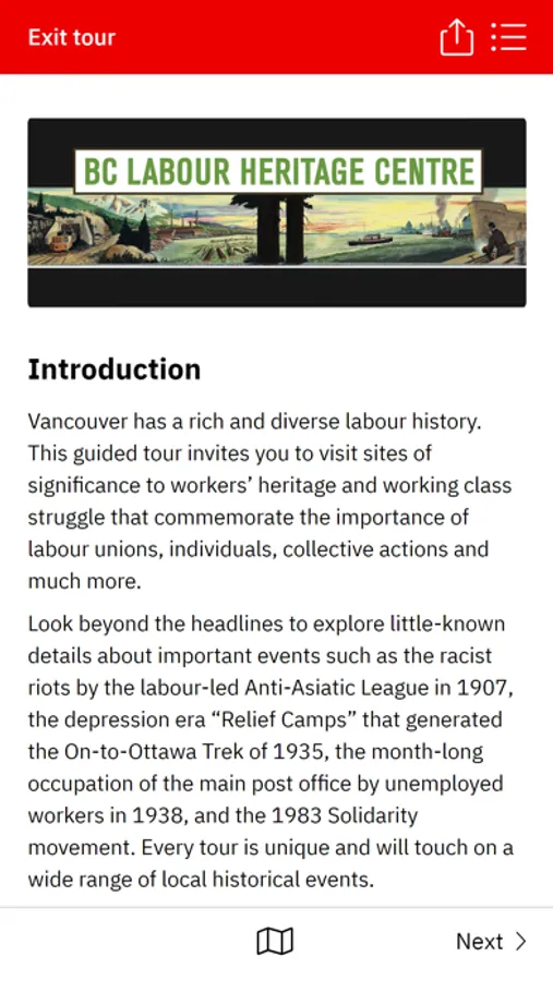 British Columbia has a rich and diverse labour history. This app from the BC Labour Heritage Centre invites you to visit sites of significance to workers’ heritage and working-class struggle that commemorate the importance of labour unions, individuals, collective actions and much more.