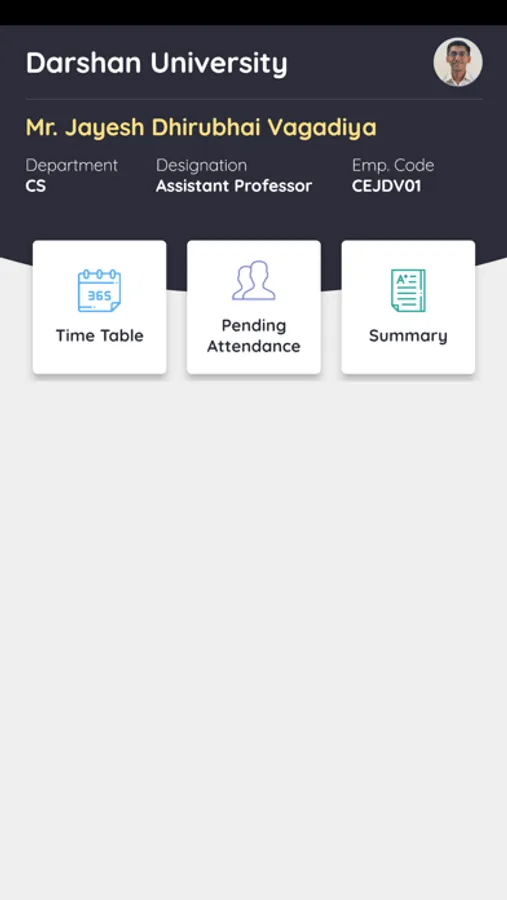 Staff details include the name of faculty, department, designation, employee code, and contact details. Faculty will be able to view timetable and fill attendance, browse through pending attendance and fill it, search a student by name or enrolment number, and summary of lectures taken.