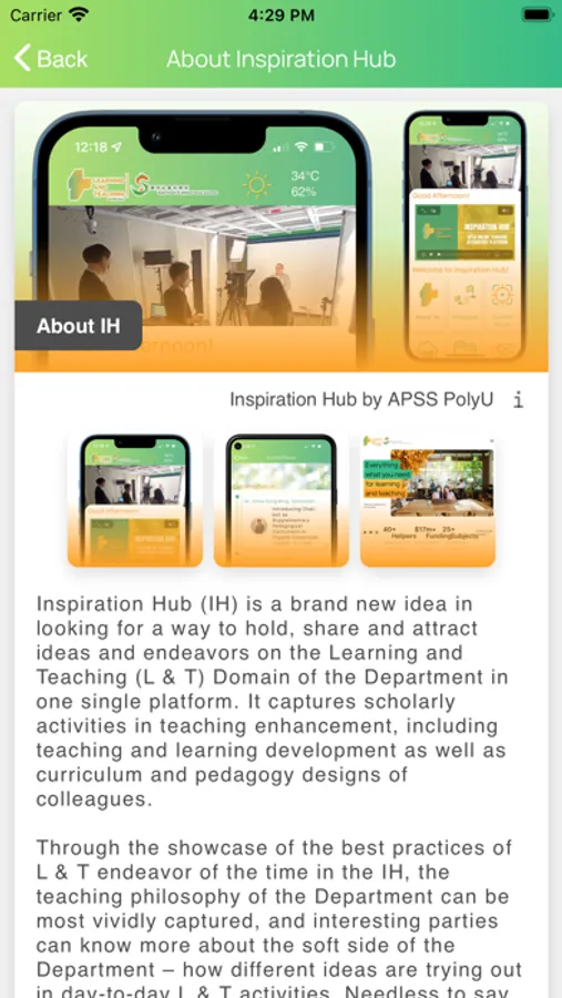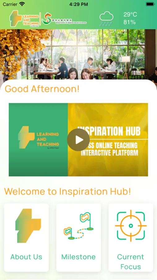 Inspiration Hub (IH) is a brand new idea in looking for a way to hold, share and attract ideas and endeavors on the Learning and Teaching (L & T) Domain of the Department in one single platform. It captures scholarly activities in teaching enhancement, including teaching and learning development as well as curriculum and pedagogy designs of colleagues.
