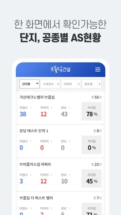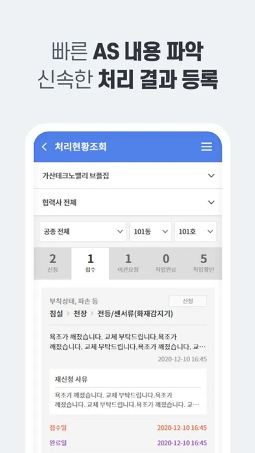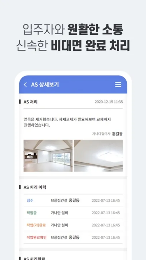 하자에 대한 접수 → 보수 → 확인 → 완료까지의 원스톱 진행