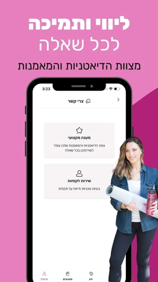 מחפשת המלצה על לחמים טובים? לא בטוחה איזה יוגורט לקנות? או רוצה עזרה כדי להתאים את התפריט למטרות שלך? דרך האפליקציה תוכלי ליצור קשר בלחיצת כפתור איתי ועם צוות הדיאטניות ולהתייעץ על כל נושא שאת רוצה. את אפילו יכולה לצלם את עצמך באימון ולשלוח לי כדי שאתן לך פידבק ואוודא שאת עושה את התנועות נכון
