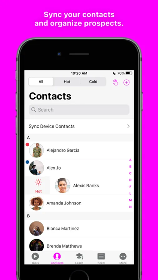 Contacts: Choose how to sync and manage your contacts. Swipe to sort them by interest level. You can make connections, add notes, or check out the Contact Feed to see the tools you’ve shared and contact actions.