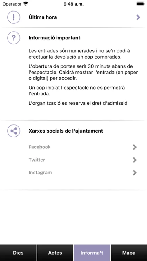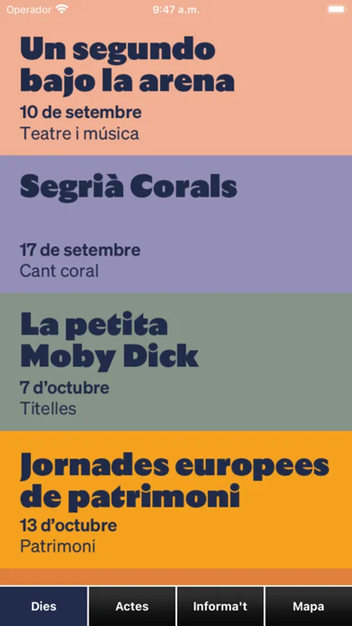 Consulta tota la informació cultural de Lo Casino des de les quatre seccions principals. Consulta els actes que es duran a terme, ubica’ls al mapa i si algú t’agrada molt afegeix-lo al llistat de preferits i no et preocupis que l’app t’avisarà uns minuts abans que comenci.