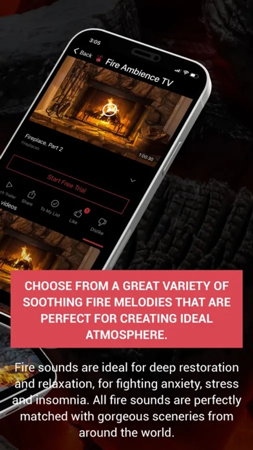 Fire Ambience TV app offers a variety of soothing crackling fire melodies that are specially created for relaxation, destress, calm and restoration!