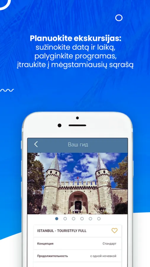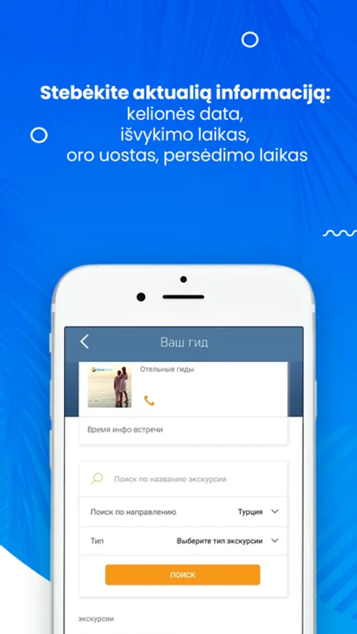 • Excursions. Explore the available excursions in the country of your vacation, find out the program and possible dates of the trip and add chosen excursions to the "Favorites" folder.