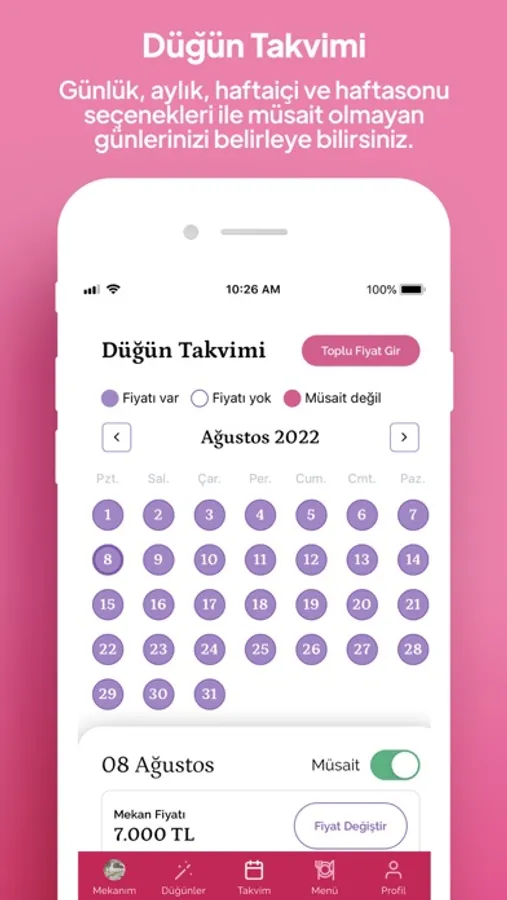 Fiyatlandırmalarınızı günlük, aylık, haftaiçi ve haftasonu seçenekleri ile müsait olmayan günlerinizi belirleyerek daha çok çifte ulaşmanız mümkün olacak.