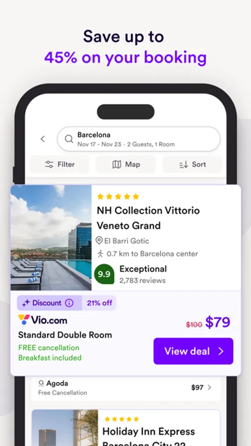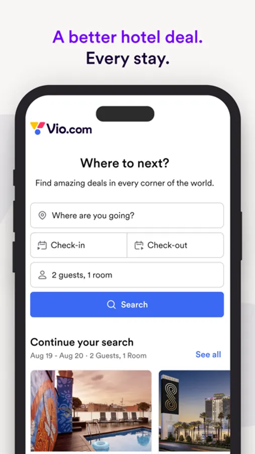 Vio.com – the ultimate travel booking app – empowers you to swiftly and effortlessly compare hotel prices and seize the finest hotel deals around the globe. Seamlessly explore millions of hotels and diverse locations, and get guaranteed access to unparalleled hotel and travel deals.