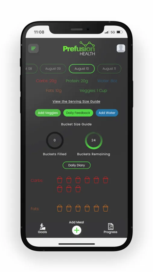 Once your goal is selected and macronutrient percentages are selected, you will receive your daily “Bucket” allocation to begin your nutrition journey with Prefusion Health!
