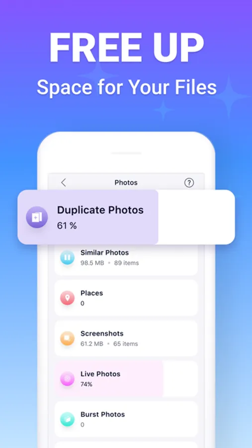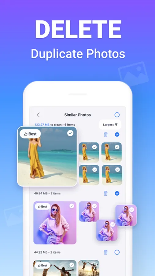 Cleaner+ scans your Photo Library and list out similar photos and find out the best among these with Artificial Intelligence. It also detect duplicate photo and videos, screenshots and provide a easy way to manage your storage by deleting them.