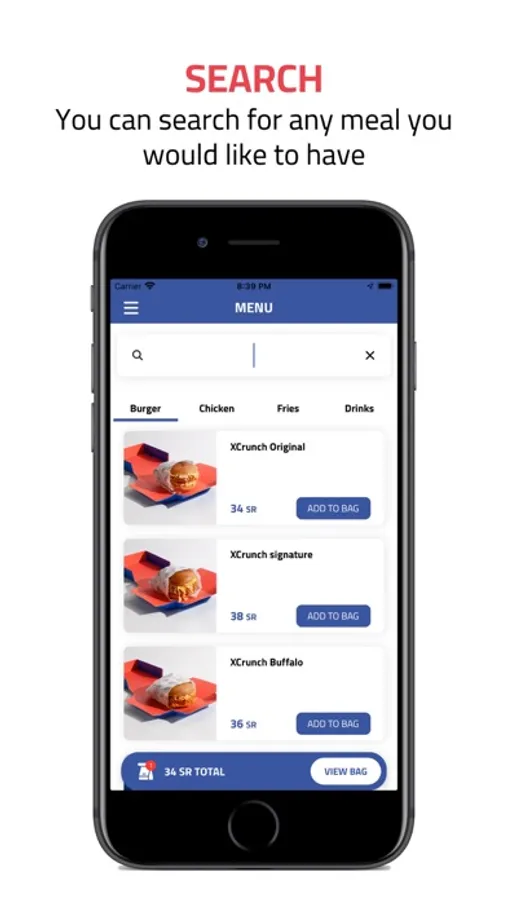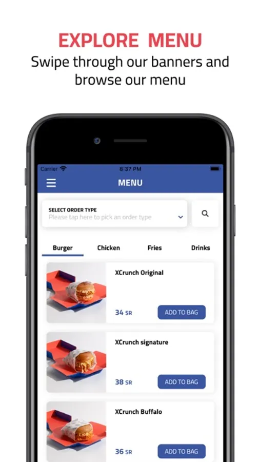 تطبيق مطعم اكس كرنش برجر، يمكن للعميل طلب الطعام اون لاين