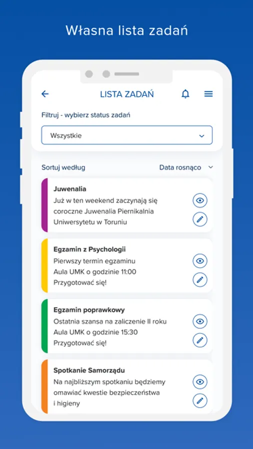Lista zadań – umożliwia studentowi dodawanie własnych zadań i ustawianie przypomnień. W module widoczne są także zadania wpisane do Kalendarza.