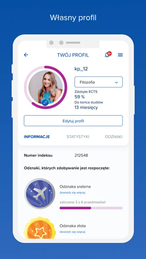 Aplikacja umożliwia zbieranie odznak za zaliczenia określonych przedmiotów oraz porównywanie swoich osiągnięć z osiągnięciami innych użytkowników aplikacji.