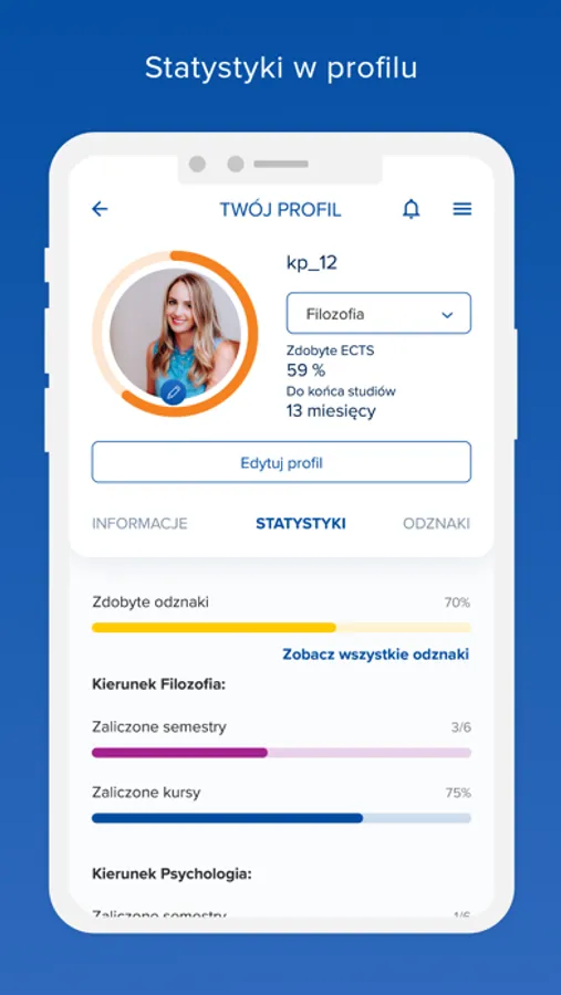 zdjęcie profilowe. W module widoczny jest etap studiowania na pasku postępu, procent zdobytych punktów ECTS oraz liczba miesięcy, które pozostały do ukończenia studiów. Moduł zawiera także statystyki dotyczące zaliczonych semestrów i kursów oraz zdobyte odznaki.