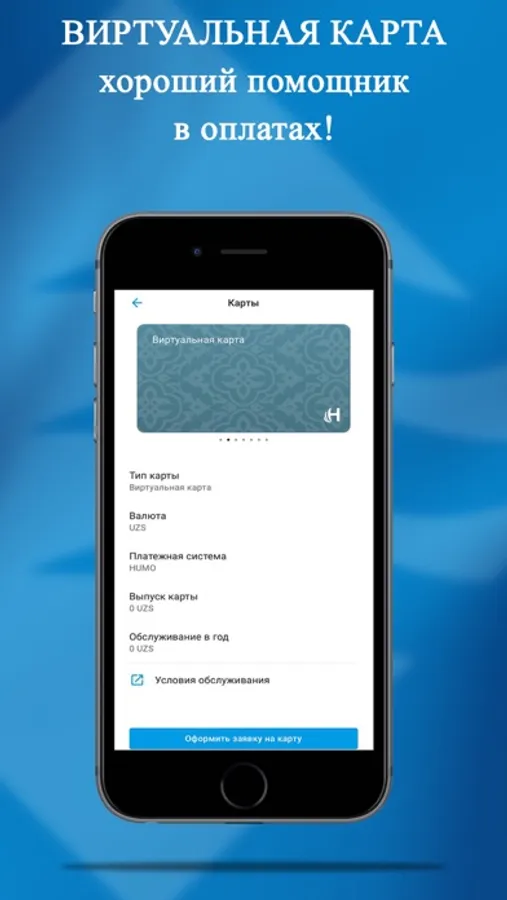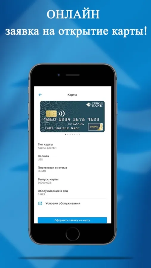 Одно из основных преимуществ нового мобильного приложения – это возможность не выходя из дома, заказать любую карту АКБ “Туронбанк”, с получением карты в любом удобном филиале, а также доставкой до двери курьерской службой Банка.