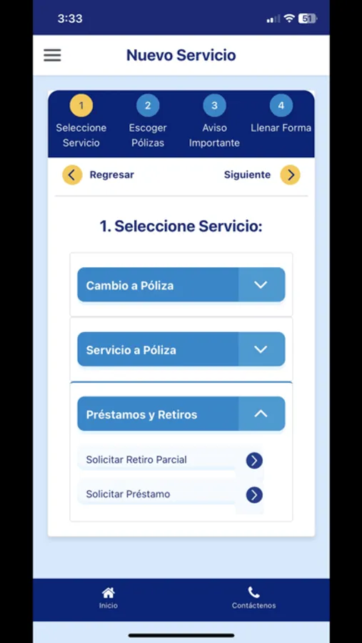 Requisar Servicio a Su Póliza, Comprar Póliza o Actualizar Su Perfil.