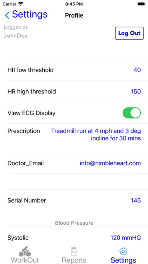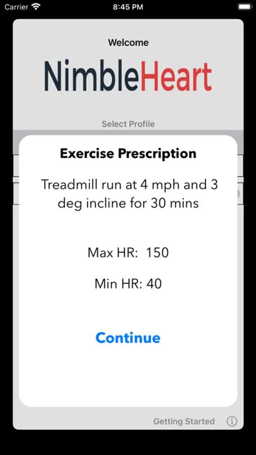 NimbleHeart Application continuously collects exercise ECG and Heart rate data from Physiotrace Smart wearable monitor over BLE interface and transmits it to NimbleHeart's secure cloud based physician portal for review and interpretation. The clinical staff from the physician's office creates the user profile and programs and updates the exercise prescription and the heart rate thresholds through the physician portal. The user can see the latest prescription and heart rate thresholds when they log into the App. The App also generates Heart Rate alerts for the user during exercise based on the prescribed heart rate thresholds. The user may see continuous ECG data during the exercise based on the physician's preferences in the exercise prescription.