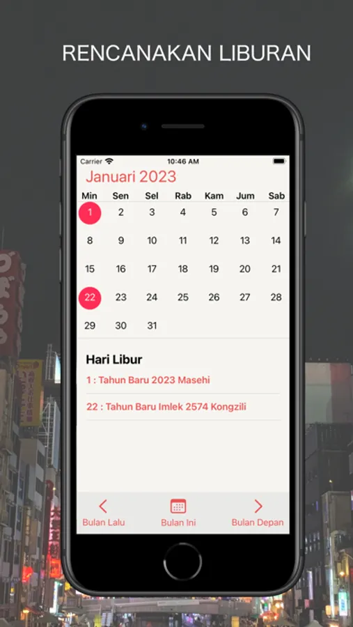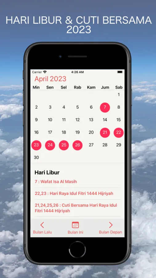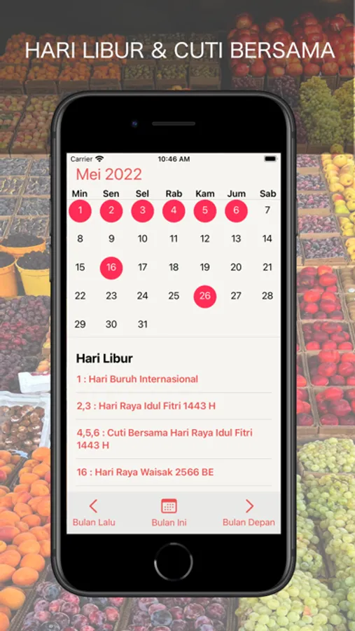 Aplikasi ini menampilkan kalender beserta hari libur dan cuti bersama yang berlaku di Indonesia.