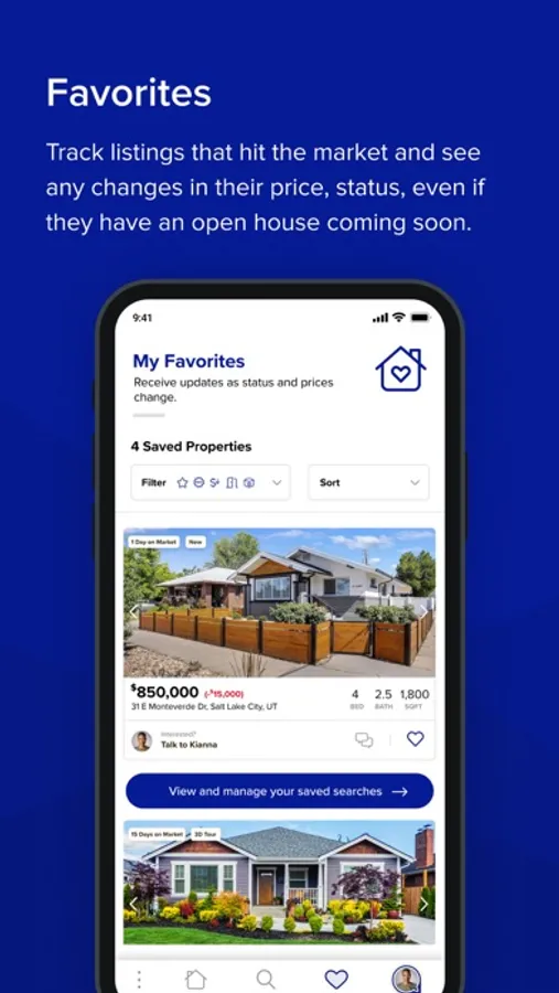 My Favorites: View saved searches and suggested homes with ease and connect with your agent for any questions.