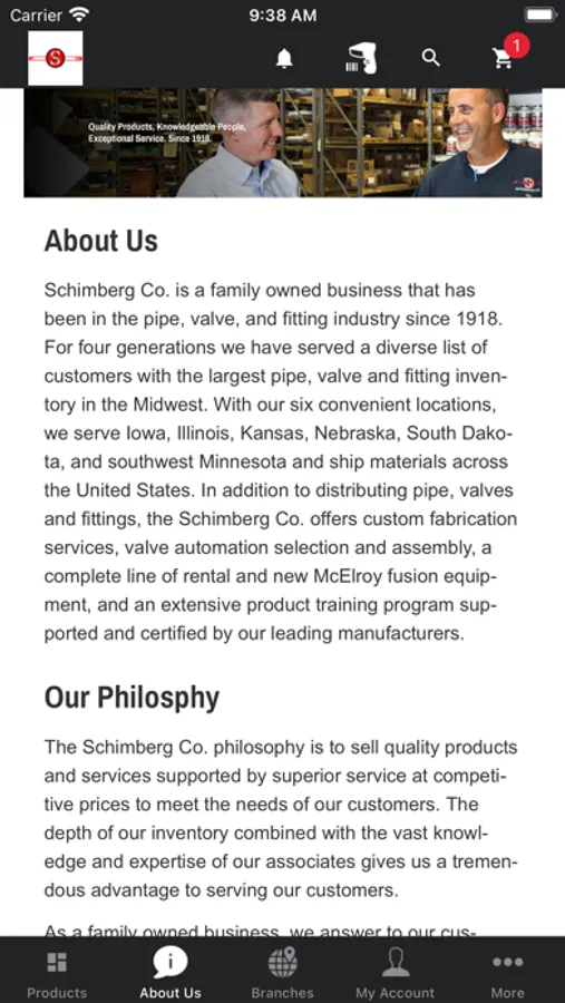 Schimberg Co. is a family owned business that has been in the pipe, valve, and fitting industry since 1918. For four generations we have served a diverse list of customers with the largest pipe, valve and fitting inventory in the Midwest. With our six convenient locations, we serve Iowa, Illinois, Kansas, Nebraska, South Dakota, and southwest Minnesota and ship materials across the United States. In addition to distributing pipe, valves and fittings, the Schimberg Co. offers custom fabrication services, valve automation selection and assembly, a complete line of rental and new McElroy fusion equipment, and an extensive product training program supported and certified by our leading manufacturers.