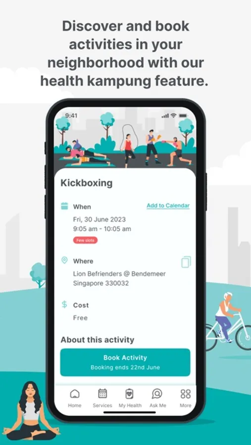 Let us be your daily health companion on your wellness journey. Enjoy easy access to your health data and services, and track the progress of your health goals. The Health Kampung feature allows residents living in the Central and North region of Singapore to book health and social programmes organised by our community partners, alongside the national programme, Healthier SG (HSG).
