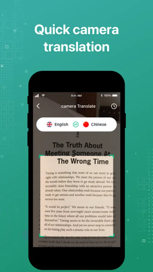 The camera translation is very easy to use . Whether it is a page that you don't understand when reading a book, or a menu or road sign that you don't understand when you travel, you can use All Translate's photo translation to help you understand them