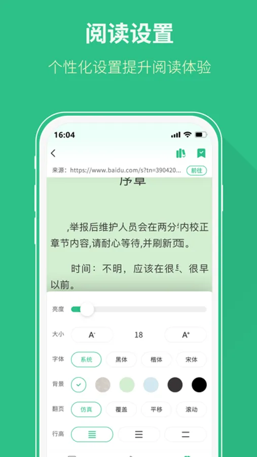 1.支持个性化阅读设置(阅读模式、背景、字体、间距自由调整和切换)