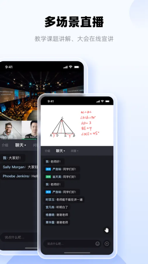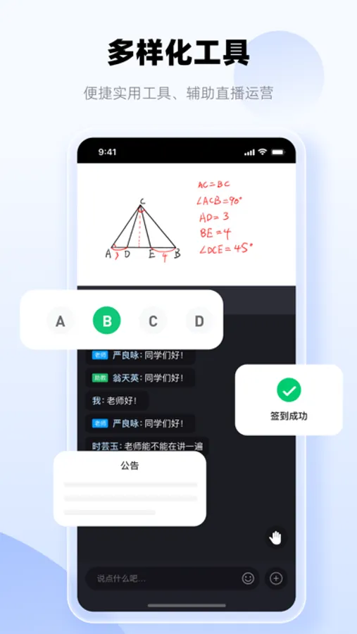 Talkcloud Live Stream is an online interactive app. In addition to live streaming, the product provides whiteboard courseware display area, online chat, voice chat, video chat, audience sign-in, desktop sharing, and video playback. These tools make communication more efficient and make interaction more real. Fully simulate offline scene to provide users with a stable, efficient and vivid online live streaming tool based on real-time audio and video services.