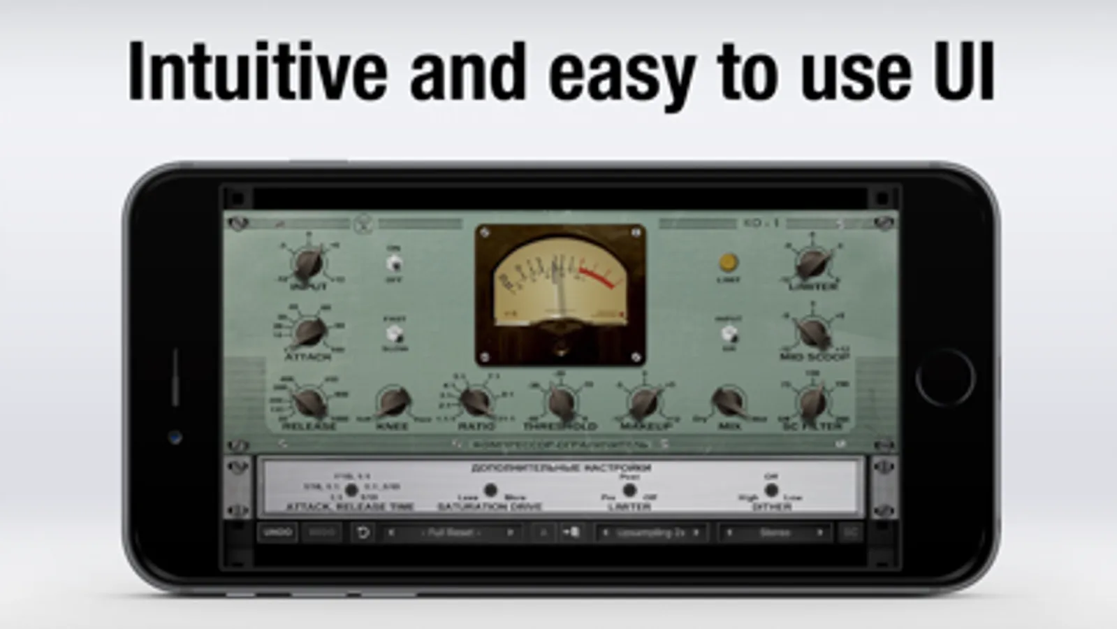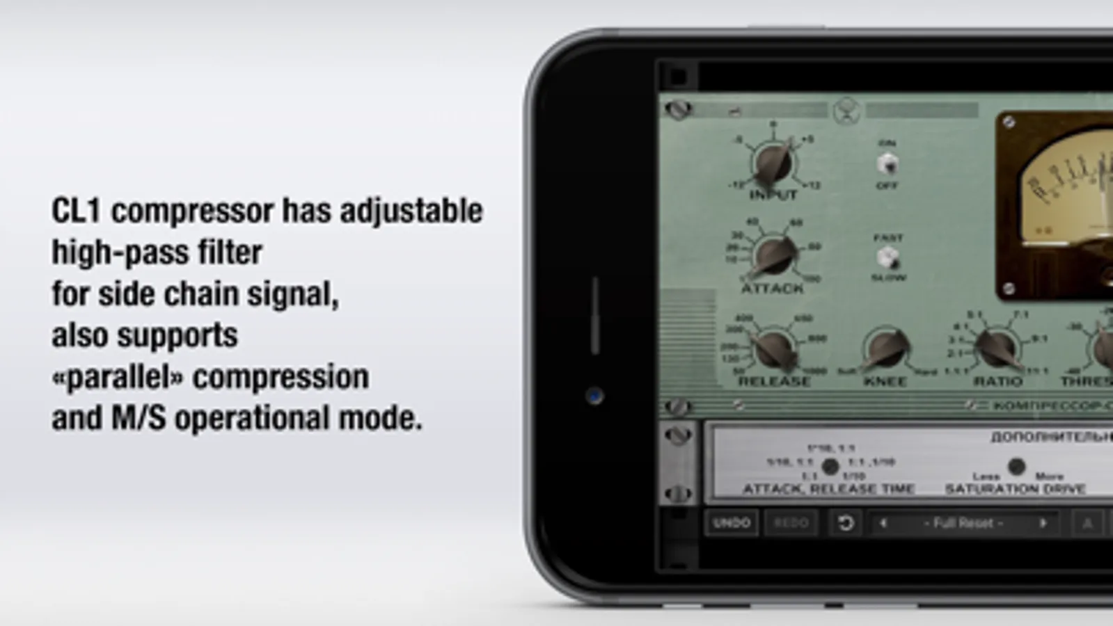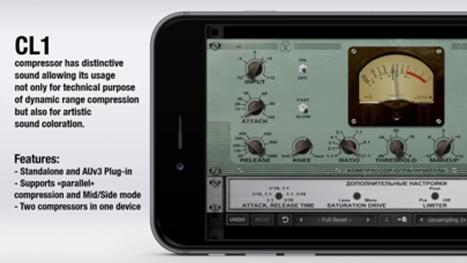 CL1 compressor besides main dynamic range compression module also contains limiting module («limiter»), which allows controlling peaks passing through the compressor, mid-range equalizer module doing ISO-226 curves equalization and input signal or gain reduction VU-meter with lamp indicator for limiter operation control. CL1 compressor has adjustable high-pass filter for side-chain signal, also supports «parallel» compression and M/S operational mode.