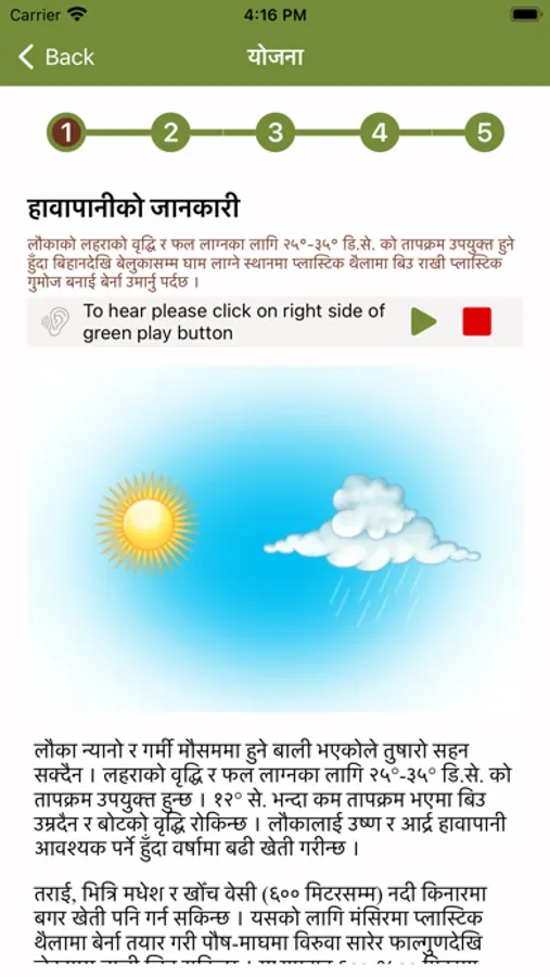 यस एपले कुन बालीमा र कुन चरणमा कति मल हाल्ने, देखी त्यस बालीमा सम्भावित मुख्य रोग र किराको सूची सँगै व्यवस्थापन गर्ने विधिको बारेमा तस्वीर सहित लखिएको हुन्छ । अझ किसानले रोग कीरा चिन्न सकेन भने उसले एप मार्फत नै रोग लागेको अंगको फोटो सहित शीर्षक र विवरण लेखी विज्ञहरुलाई पठाउन पनि सक्छन्। कृषकको प्रश्नको उत्तर भने विज्ञहरुले एप मार्फत नै दुई देखी तीन दिनमा दिने छन् ।