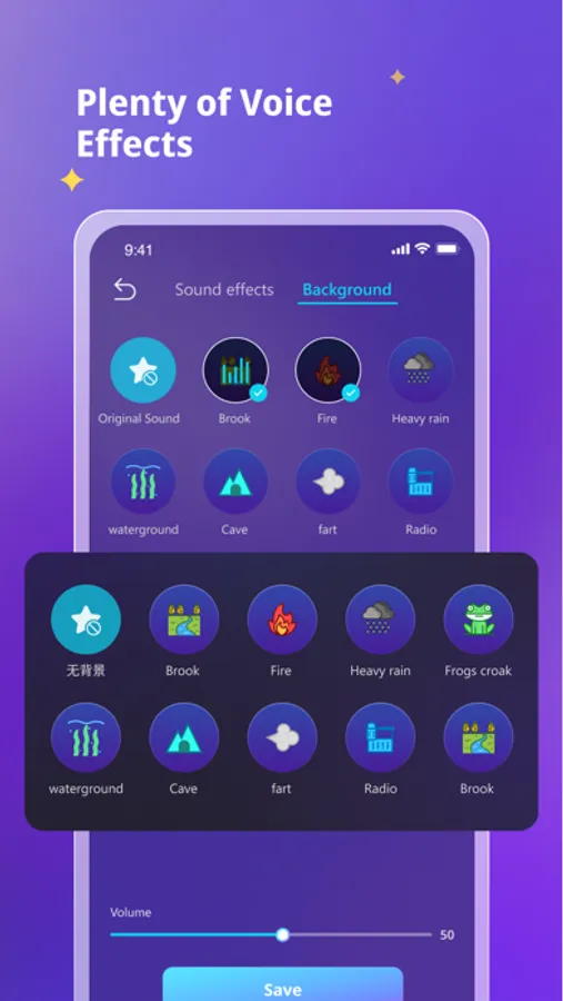 With various background sound effects, it is possible for you to create different environment sounds and make your audio change more natural and vivid.