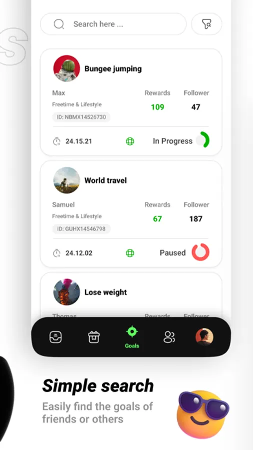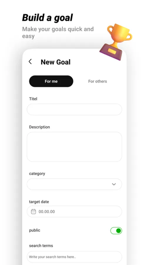 Goalship is a social network for creating and sharing your personal, professional, cultural, sporting or social goals. You decide by invitation who gets to see these goals: people from your circle of friends or acquaintances, from your family or relatives, from your club or company - or publicly visible for everyone in the Goalship community. Or you can simply use Goalship as a reminder and notepad for yourself... For reaching your goals or implementing your ideas for the common good (or your club, company, etc.) your invited friends can support you in different ways: Through motivational comments in the chat, likes, concrete offers of help or rewards/rewards for reaching your goals. And: The Goalship app is "Made in Germany" according to German data protection rules and free of charge by all users!