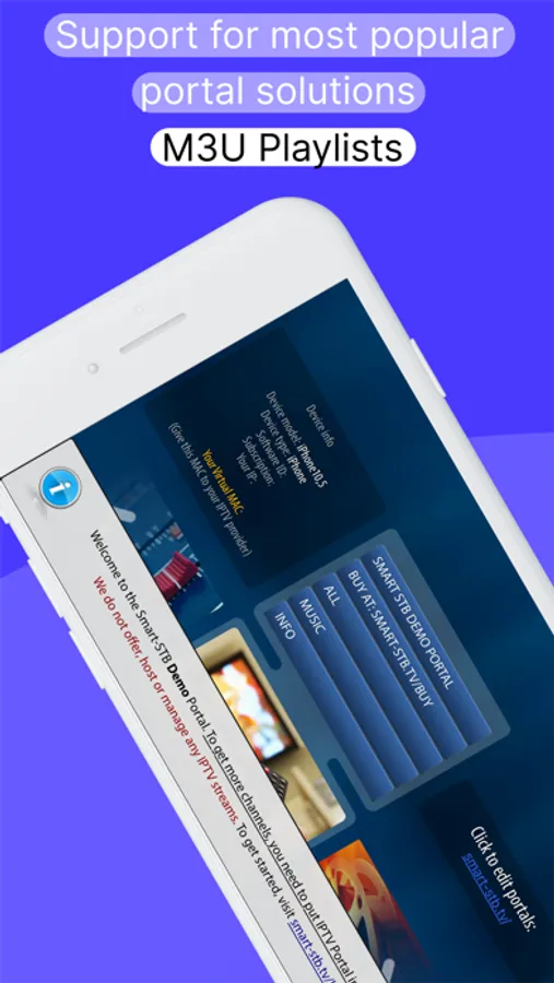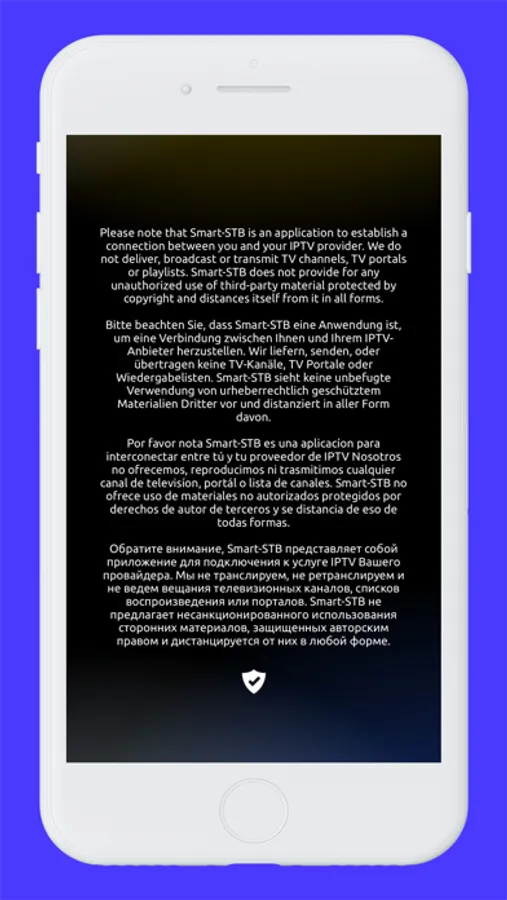 Please note that Smart STB is an application to establish a connection between you and your IPTV Provider. You need a valid subscription from a streaming service provider. We do not deliver, broadcast or transmit TV channels, TV portals or playlists. Smart STB does not provide for any unauthorized use of third-party material protected by copyright and distances itself from it in all forms.