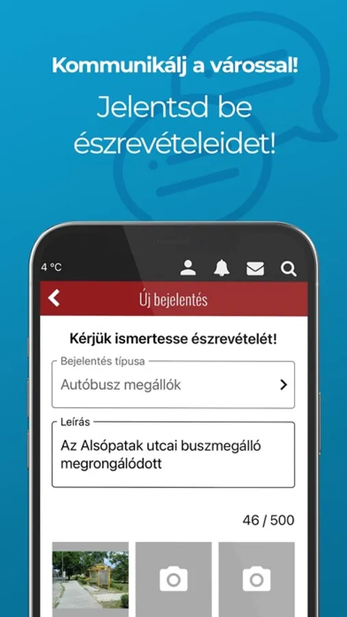 • Városi bejelentő: Lehetőséged nyílik a településen felismert rendellenességek mobiltelefonon keresztüli bejelentésére és a bejelentések nyomon követésére. A bejelentés pontos helye GPS koordináta alapján vagy cím beírásával is történhet. A bejelentések közvetlen a város megoldó csoportjához érkeznek a bejelentés típusa alapján, ahol megkezdődik a feldolgozás.