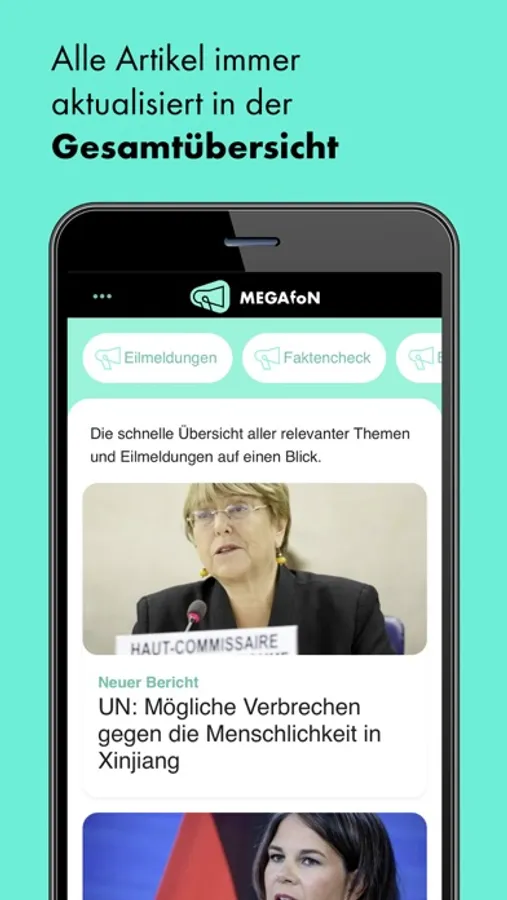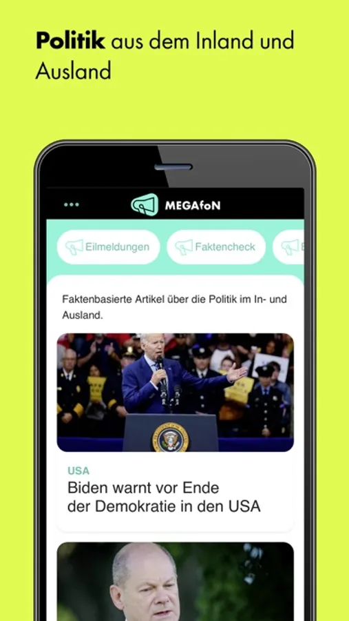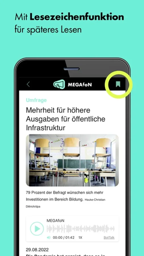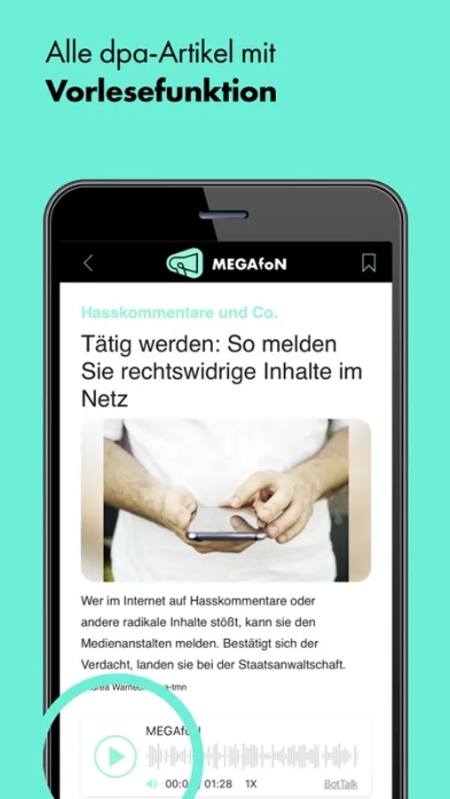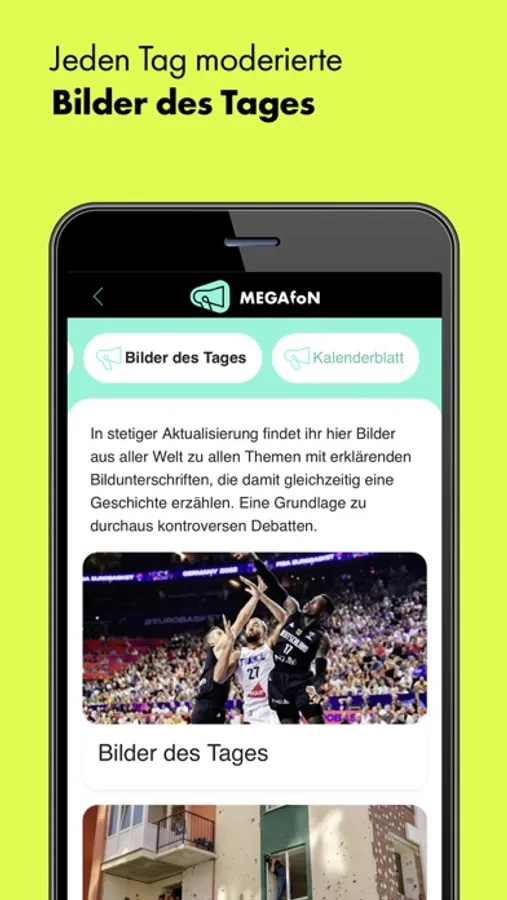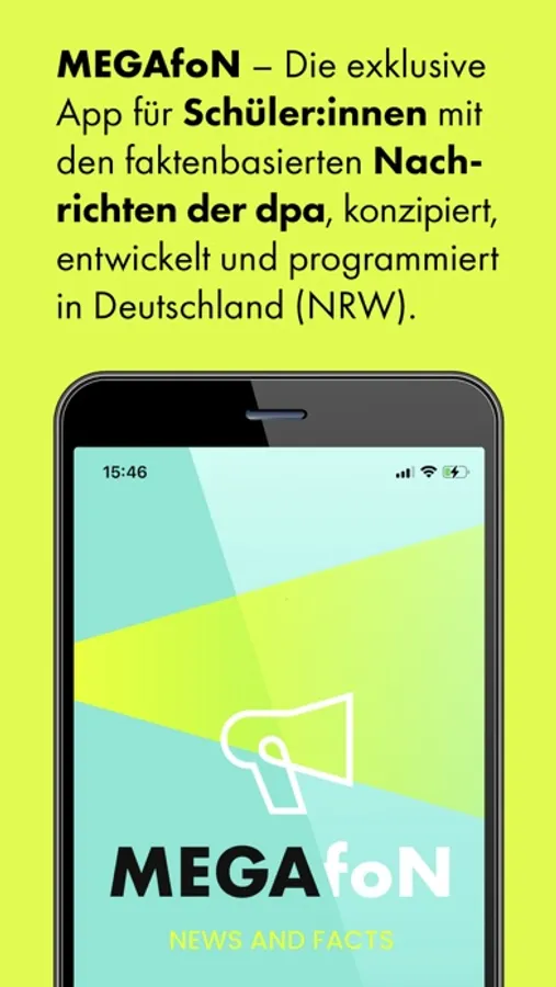 100ProLesen mit ihrem mobilen Nachrichtenformat MEGAfoN® unterstützt die Förderung der eigenen Meinungsbildung von Schüler:innen in Schulen. Um die App im vollen Umfang nutzen zu können, bedarf es eines Codes, den Schüler:innen von ihren Lehrer:innen erhalten, sobald diese App in der entsprechenden Schule eingesetzt wird.