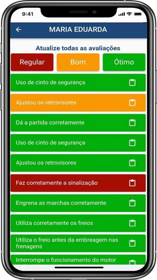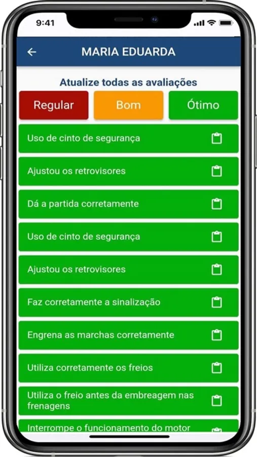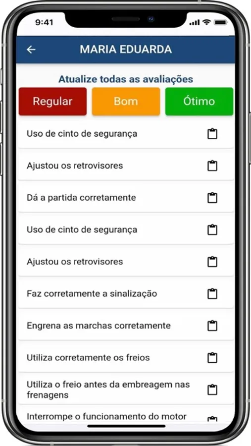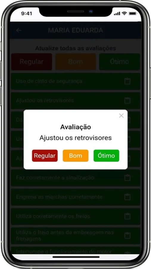 Nesta mesma tela o instrutor(a) pode realizar a Avaliação do aluno(a) para cada aula, podendo assim ter um histórico e avaliar a evolução do aluno(a).