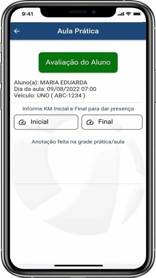 Na área de aulas práticas, o instrutor(a) inicia a aula do aluno(a) informado Km inicial e final, com isso a presença do aluno(a) é informada automaticamente.