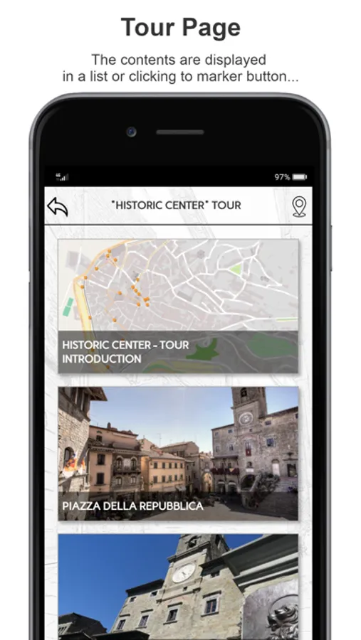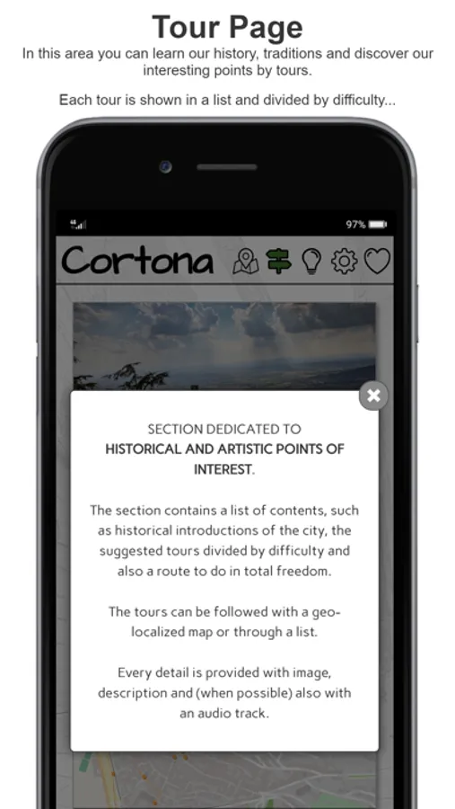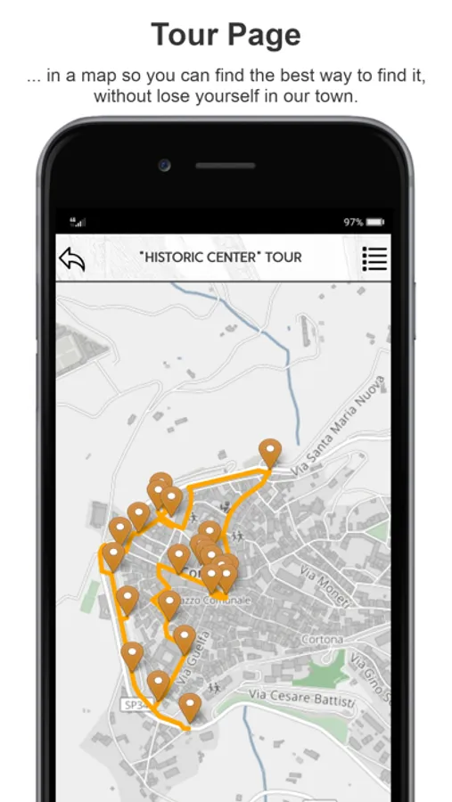 - Tour Area: introduction to the town and indication of tourist itineraries with location and geolocated map