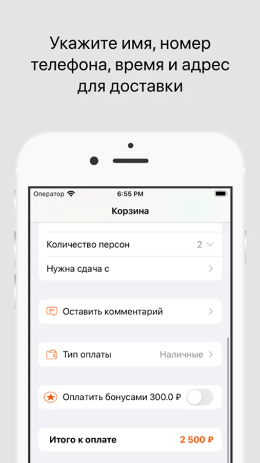 Укажите время, когда хотите прийти за своим заказом или выберите доставку с указанием времени и адреса доставки.