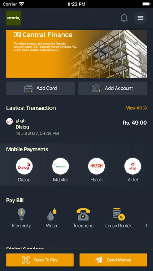 “Centrix” is a digital (FinTech) Payment App powered by Central Finance Company PLC. Download the Centrix app for bank to bank money transfer via JustPay and CEFT & instantly, pay at shops (merchant locations) using LankaQR and make your bill payments with ease and conveniently. Use Centrix for mobile recharge, Postpaid bill payment, Utility bill payment such as Water, Electricity, Landline, Broadband and insurance. All transactions effortlessly perform in a few clicks.
