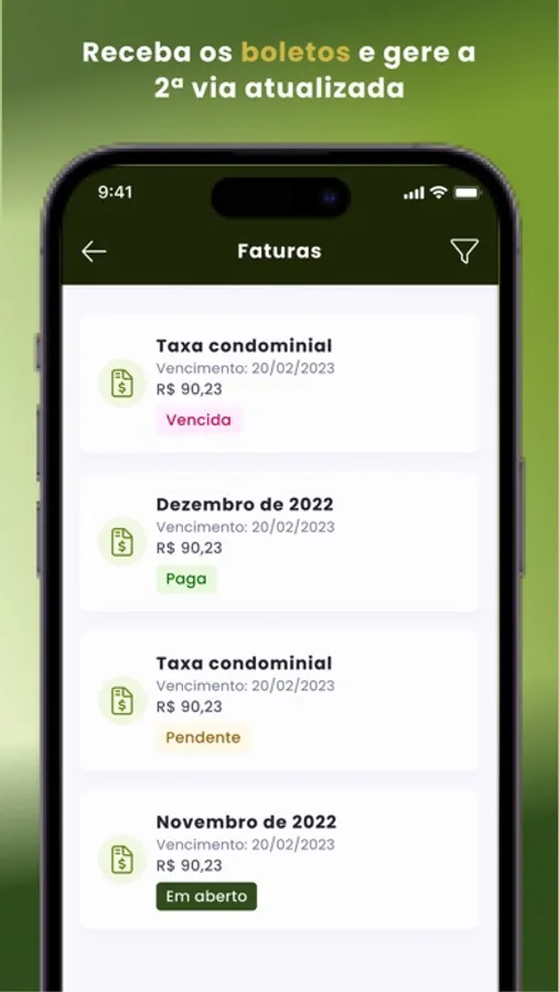 • FATURAS: Receba a taxa condominial pelo app e com 1 clique copie o código de barra para pagar em seu Internet Banking. Venceu? Sem problemas: gere a 2ª via e pague na hora! Chega de boletos em baixo na porta ou horas no telefone para gerar uma 2 via.