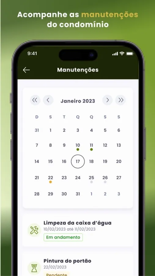 • MANUTENÇÕES: Fique por dentro de quando irá acontecer aquela limpeza da Caixa D'Água e se programe para as manutenções do condomínio. Síndicos se organizam com as demandas do condomínio. Chega de transtornos e falhas de comunicação em manutenções.