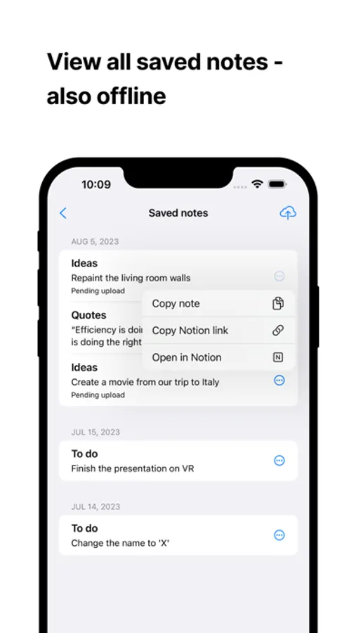 Saved notes: view all of the saved notes - also offline. You can copy each note or open it in Notion