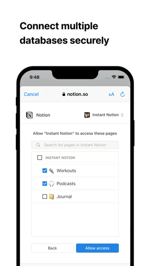 Secure: use the official Notion authorisation method, without generating your tokens manually. Your data is transmitted directly to Notion.