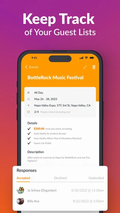 - Guest List Manager - Keep track of RSVP & your guest list! Let your invitees check in easily on your event!