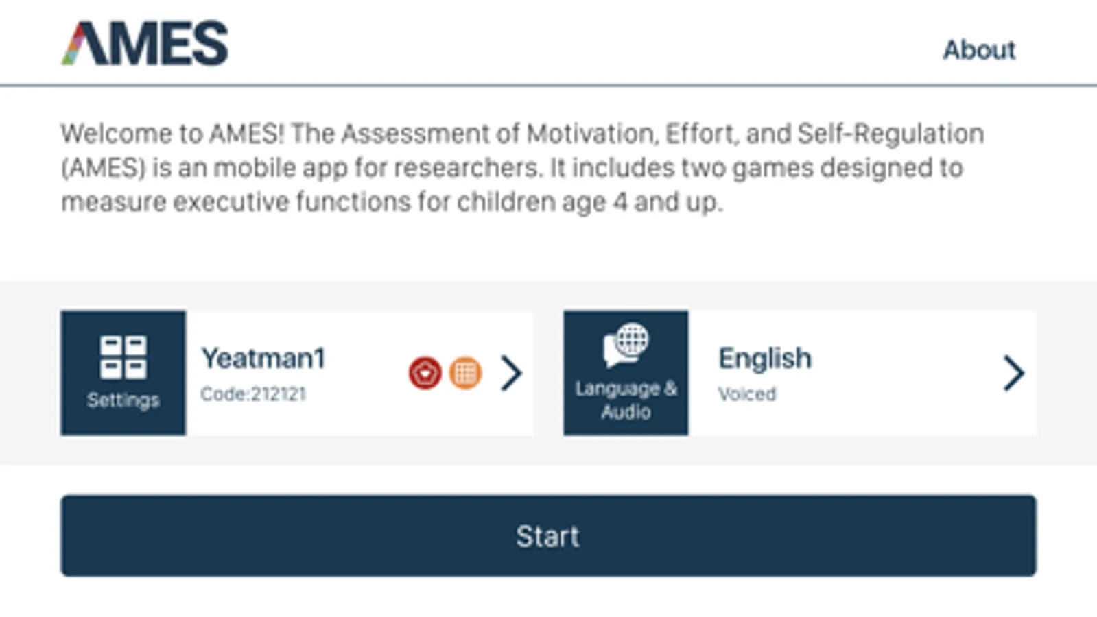 The Assessment of Motivation, Effort, and Self-Regulation (AMES) is a mobile app for researchers. It includes two tasks designed to assess executive functions and delay of gratification in children. The app has been tested extensively with children ages 4 to 12 in the U.S., Ivory Coast, and Ghana.