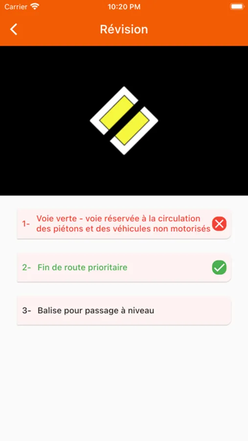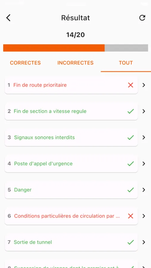 Grâce à notre mode d'apprentissage, vous pouvez cocher les éléments que vous connaissez déjà pour mesurer votre progression. Vous pouvez également tester vos connaissances grâce à notre module de test de code de la route, disponible avec ou sans minuteur, et choisir le nombre de questions et le temps qui vous conviennent le mieux. À la fin de l'examen, votre résultat est affiché et vous pouvez revoir toutes les questions et leurs réponses.