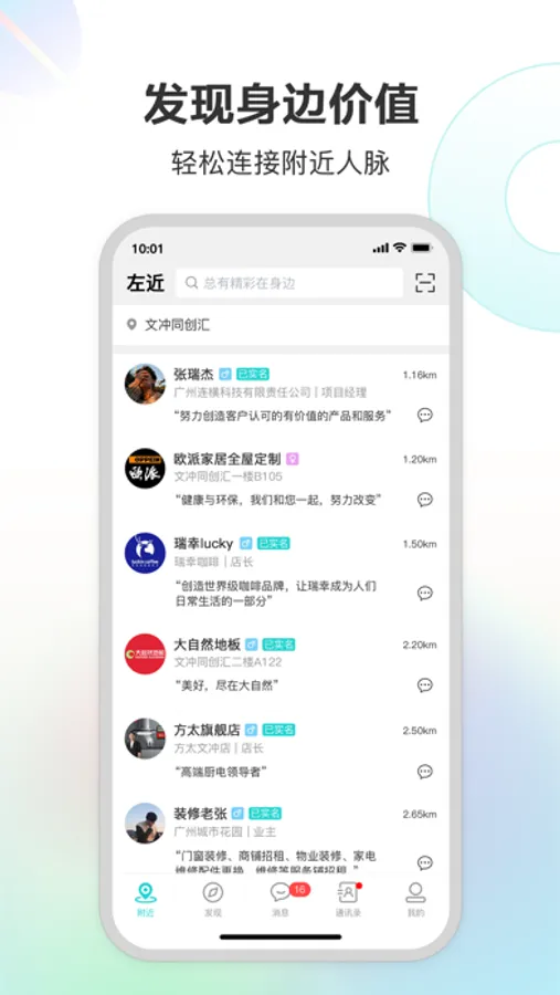 左近是基于当前定位信息展示附近价值人脉的陌生人社交软件,帮助用户发现身边价值,展现自我精彩,在这里可以随时随地与附近的朋友打招呼聊天,拓展你的价值人脉。